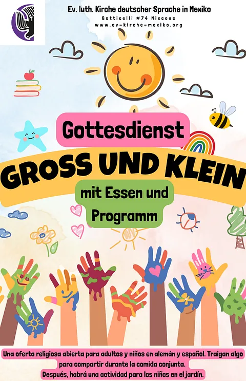 Sonntag, 18. Januar um 12 Uhr in der Heilig-Geist-Kirche, Botticelli 74 Mixcoac. Wie immer zweisprachig und geeignet für alle Altersgruppen. Im Anschluss laden wir zum Basteln und Spielen im Pfarrgarten ein. Gern etwas für das Buffet mitbringen. Wir wollen zusammen essen.